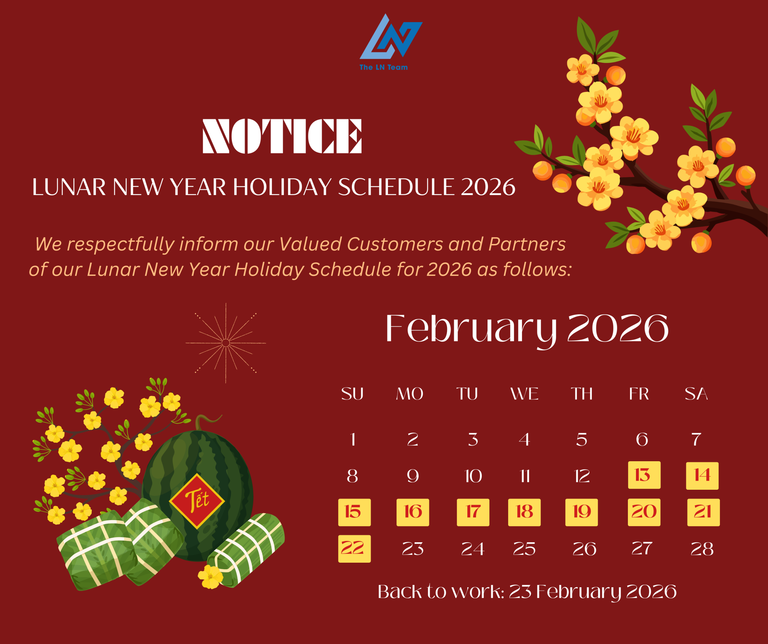 To ensure continued support for our Valued Clients during the upcoming Lunar New Year Holiday 2026, Le Nguyen would like to respectfully announce our holiday schedule as follows: