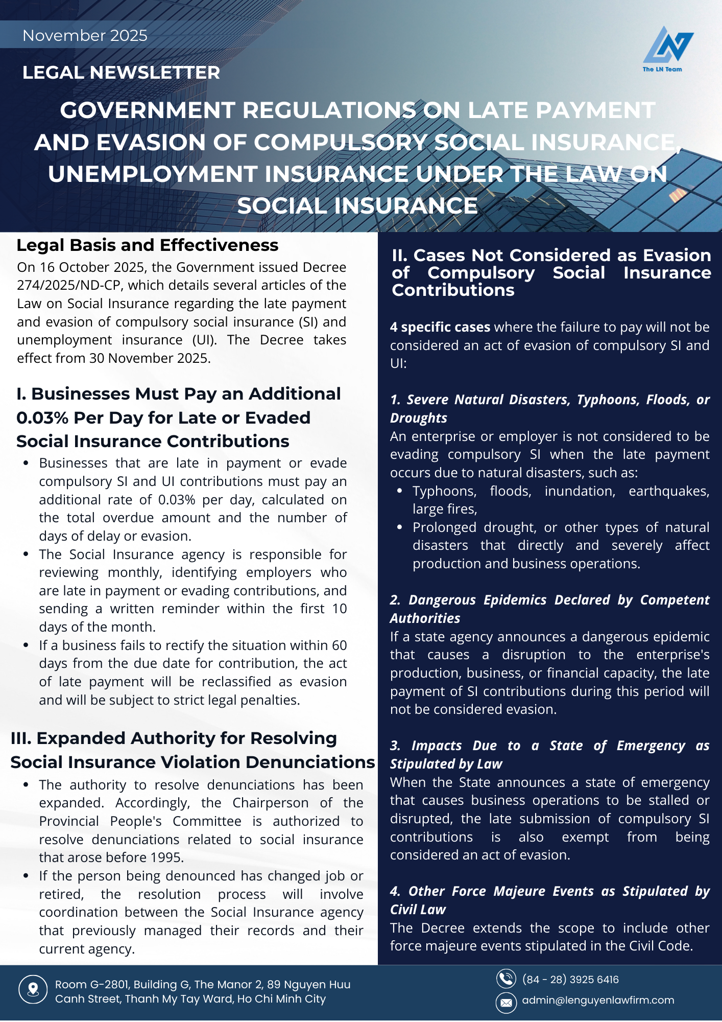 On 16 October 2025, the Government issued Decree 274/2025/ND-CP, which details several articles of the Law on Social Insurance regarding the late payment and evasion of compulsory social insurance (SI) and unemployment insurance (UI). The Decree takes effect from 30 November 2025.